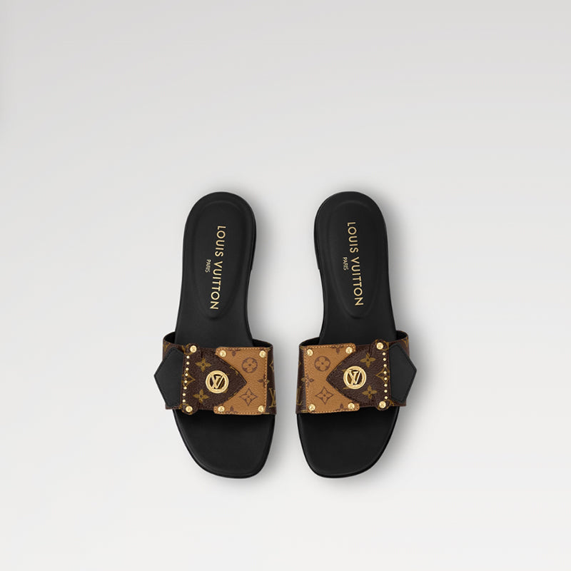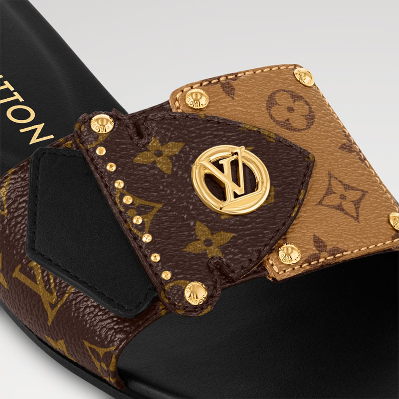 • LV フレーム フラット サンダルは、モノグラムとモノグラム リバース キャンバスを組み合わせ、スタイリッシュでリラックスした雰囲気を演出します。幅広のフロントストラップには、カメラボックスバッグの留め具からインスピレーションを得たスタッズとLVサークルロゴがあしらわれ、耐久性に優れたレザーのアウトソールがアクセントになっています。