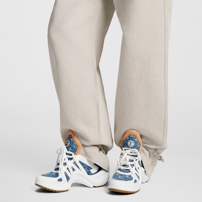 - LV アーチライト スニーカーは、ブリーチ モノグラム デニムで作られ、ルイ ヴィトンの特徴的なレザーでトリミングされ、ブランドの特徴的なシルエットを新たに取り入れています。幅広のシュータンと伸縮性のある波形のアウトソールがユニークなタッチを加え、LVサークルロゴがブランドのアイデンティティを強調しています。