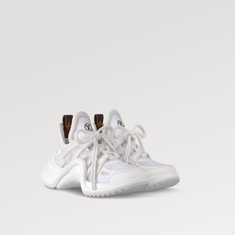 - この LV アーチライト スニーカーは、モノグラムの花柄レースが特徴で、クラシックなデザインにエレガントなタッチを加えています。幅広のシュータンと波形のアウトソールにはLVサークルのロゴがアクセントになっており、デュアルシューレースとモノグラムキャンバスのリアストラップがデザインを完成させています。