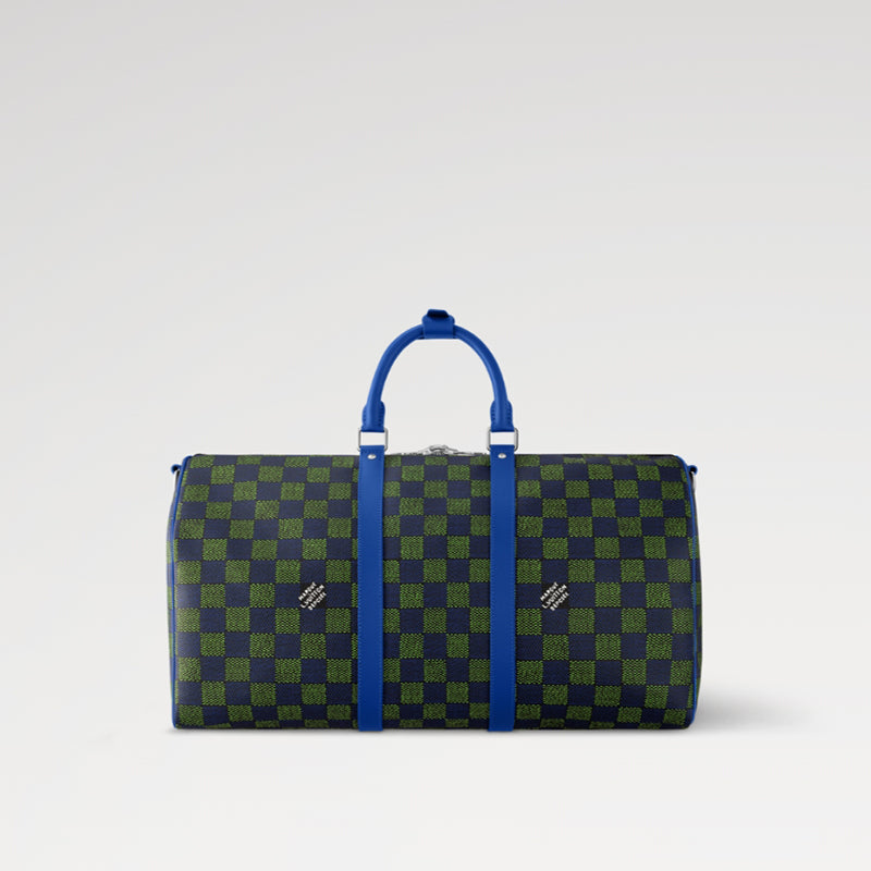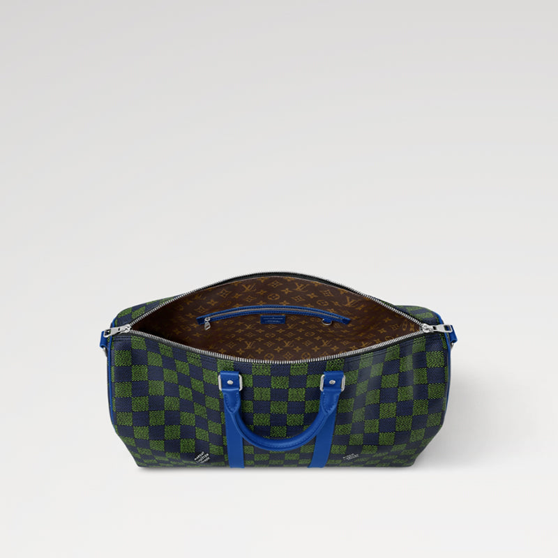 - ファレル・ウィリアムズがデザインしたキーポル バンドリエール 50は、ダミエ・ヘリテージ・コーテッドキャンバスを使用。チェッカーボード模様に、アイコニックな「Marque Louis Vuitton Déposé」の文字がアクセントを添えています。カーフスキンレザーのトリム、トップハンドル、取り外し可能なショルダーストラップがバッグ全体を彩り、内側にはモノグラム・キャンバスのライニングが施され、ブランドの伝統へのオマージュを表現。