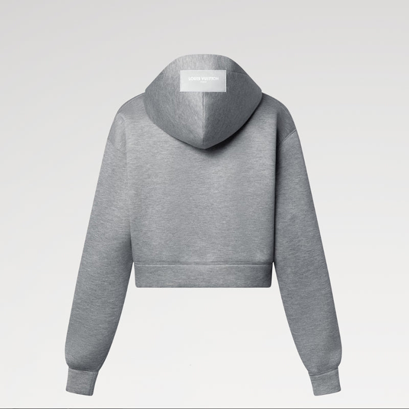 - ランウェイのシックなシグネチャーで遊び心たっぷりに再解釈された定番フーディ。暖かいダブルフェイスのジャージーにカジュアルなヘザー仕上げを施した、快適なクロップドシェイプの1着です。ゆったりとしたフードには同系色で「Louis Vuitton」のスカーフタグを配し、ネックラインにはエレガントなモノグラムのタイを配してトロンプ・ルイユ(騙し絵)のシルクスカーフ風の効果を演出しています。