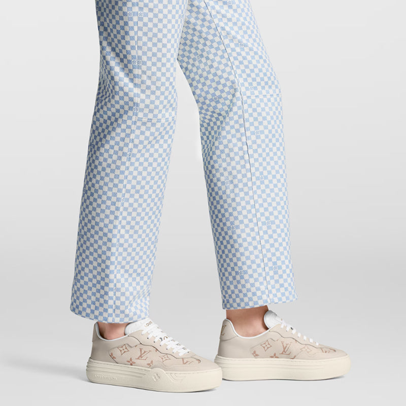- 1970年代から着想を得たアッパーとトレンディなプラットフォームアウトソールを組み合わせた「LV グルービー・ライン スニーカー」。アッパーにはルイ・ヴィトンの2024クルーズ・ファッションショーに登場したモノグラム・デュンヌ キャンバスを使用し、同色のレザーのトリミングで仕上げました。ラバーアウトソールにはモノグラム・フラワーと「Louis Vuitton」シグネチャーをあしらい、トレッドにはダミエ・パターンが彩りを添えます。