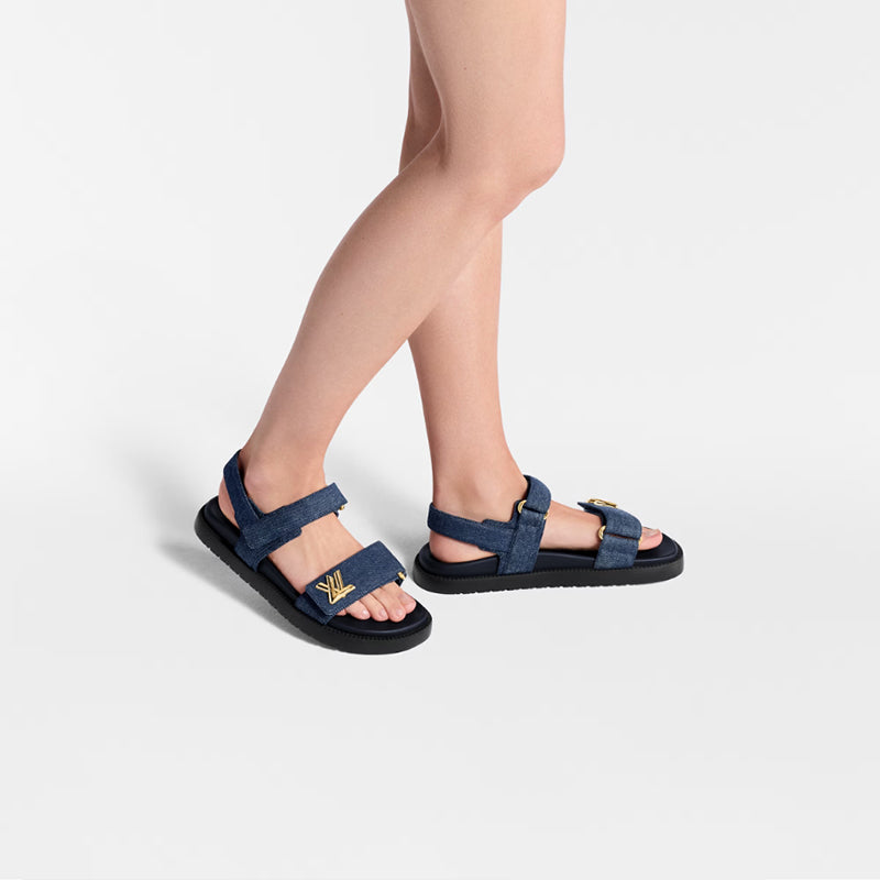 • この LV サンセット フラット サンダルは、新シーズンに向けてクラシックなシルエットにプライマリー デニムを組み合わせて再解釈され、夏のリラックスした雰囲気を醸し出しています。調節可能なベルクロ レースが目を引くディテールを加え、上部のベルクロ レースには LV ツイストの装飾が施されています。パッド入りの弾力性のあるインソールと軽量のマイクロアウトソールが、快適な履き心地を実現します。