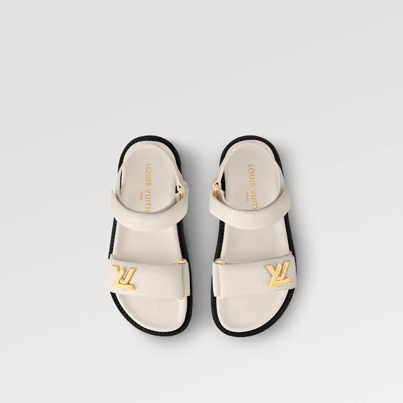 柔らかいグレインカーフスキンで作られたこの LV サンセット フラット サンダルは、ベルクロで調節可能なパッド入りレースと、快適なフィット感を実現する柔軟なインソールが特徴です。 LVツイストの装飾がアッパーに最後の仕上げを加えます。