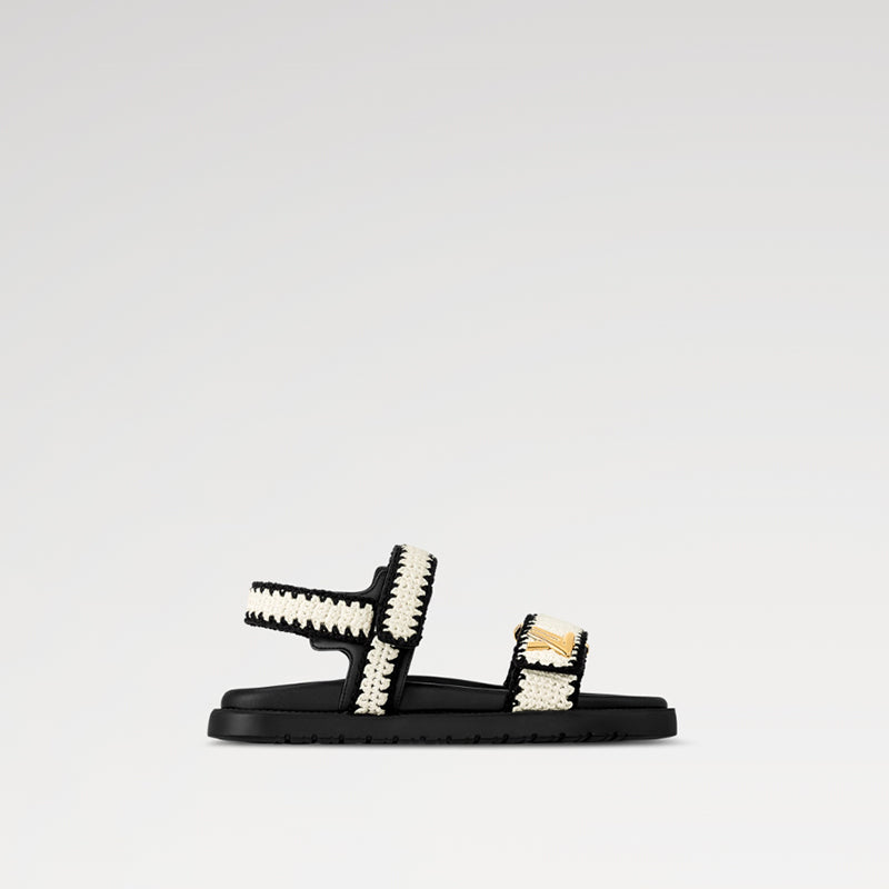 • 「LV バイ・ザ・プール」コレクションに登場するルックとマッチする、コットンクロシェ(かぎ針編み)で表現した「LV サンセット サンダル」。トレンディで快適な履き心地のサンダルに、クロシェ(かぎ針編み)が洗練された職人技でひねりをプラス。調節可能なベルクロ・ストラップとゴールドカラーのLV ツイストのアクセサリーが特徴です。アナトミックインソールと軽量なマイクロアウトソールで仕上げました。