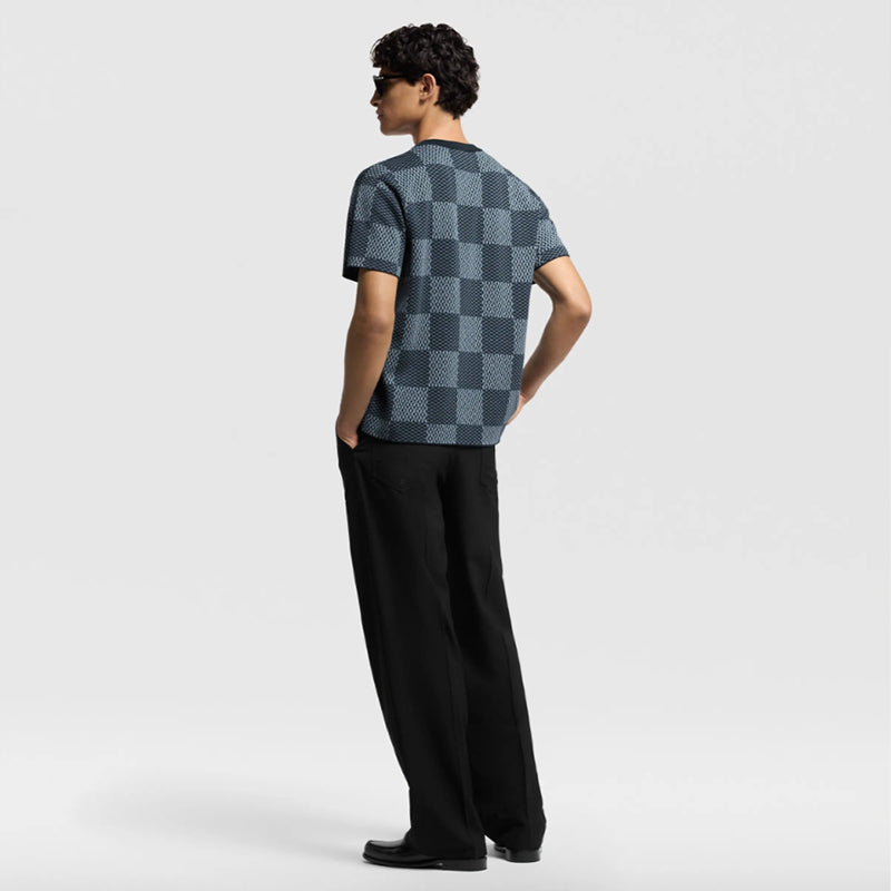 - 普段の装いにグラフィカルなひねりを加えるショートスリーブのコットンクルーネック。深みのあるネイビーカラーのジャカードで再解釈したエンブレマティックなダミエ・パターンを全面にあしらいました。胸元のLV イニシャルをストラスで刺繍したパッチが、このステートメントピースに洗練されたタッチを添えています。