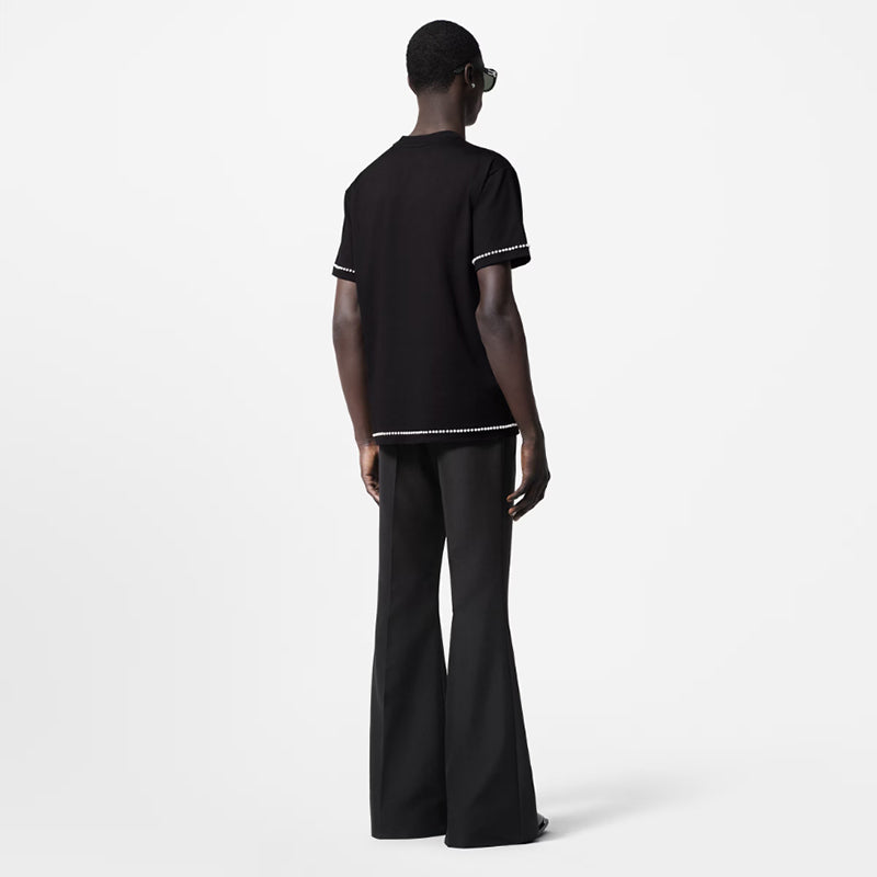 コットン製のこの T シャツは、袖と裾に真珠のようなスタッズがあしらわれており、クラシックなシルエットにダンディなひねりを加えています。胸元に施された光沢のある「Marque L.Vuitton déposée」の刺繍が洗練された雰囲気を醸し出します。