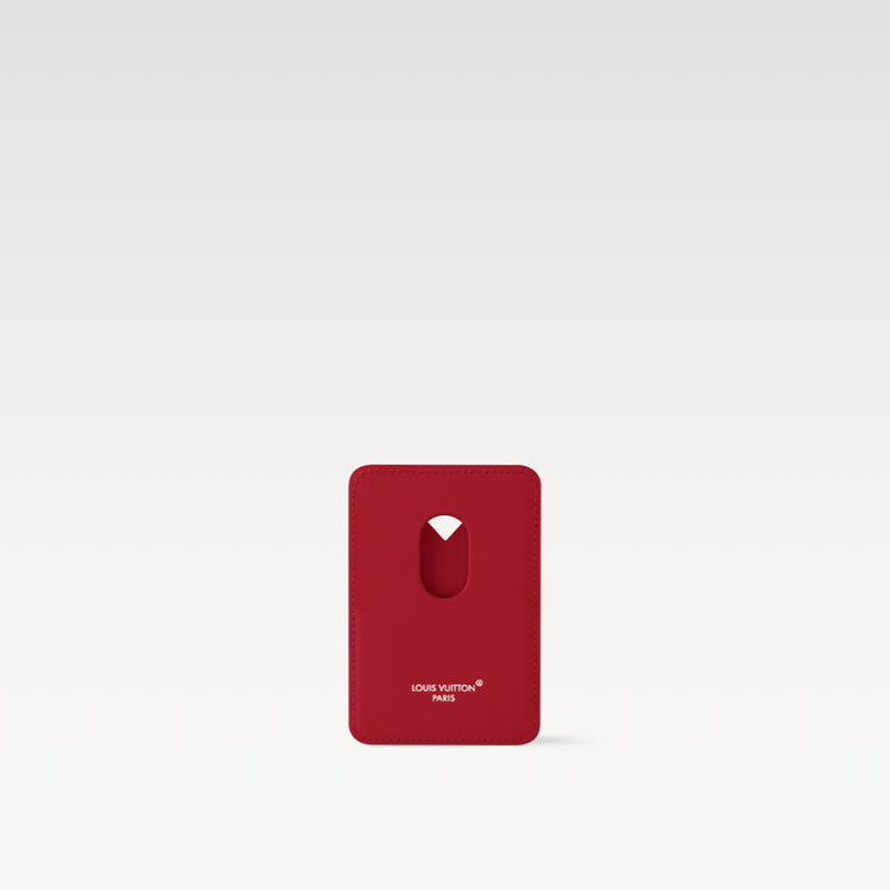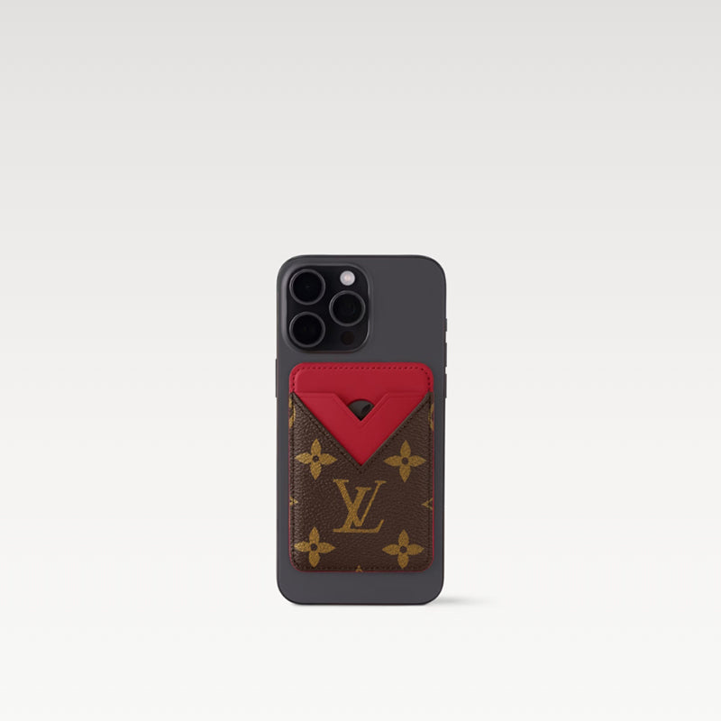 • モノグラム・マカサー キャンバスで仕立てた「ポルト カルト・マグネット」。マグネットを組み込んだデザインで、MagSafeを搭載したiPhone12以降のすべての機種に簡単に取付けられます。メゾンのアイコニックな「V」シェイプの2つのカードスロットが特徴。カラーレザーのライニングとトリミングでポップな雰囲気に仕上げました。