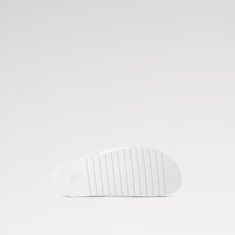 • シンセティックレザーで再解釈した今シーズンの「マイアミ ミュール」。アイコニックなモノグラム・パターンをエンボス加工で施してパフ感を生み出した、幅広なパッド入りのフロントストラップが特徴です。快適なアナトミックインソールと軽量のマイクロアウトソールを配し、履き心地抜群でリラックス感のある1足に仕上げています。