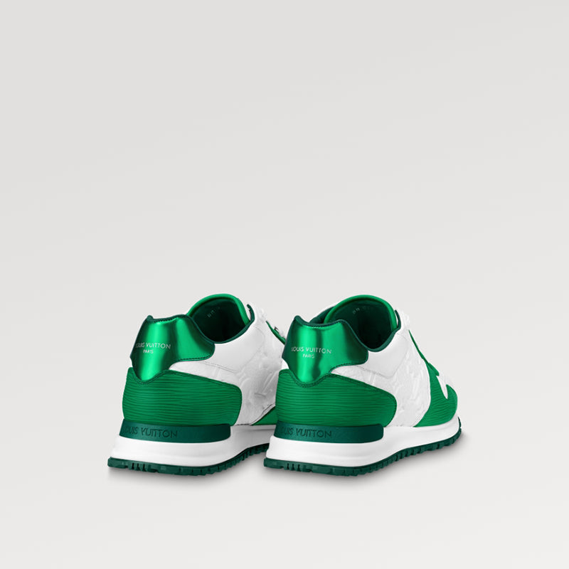 - ランアウェイスニーカーは、伝統的なランニング シューズにインスピレーションを得たもので、エピとモノグラムのエンボス加工を施したグレインカウハイドから作られています。アイコニックなデザインはウェッジアウトソールにも引き継がれ、タンと後部にLVのレタリングとルイ・ヴィトン パリのロゴが施されています。