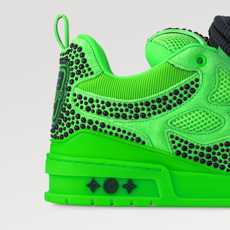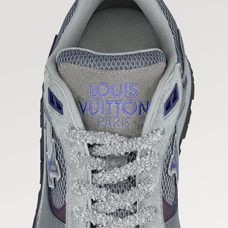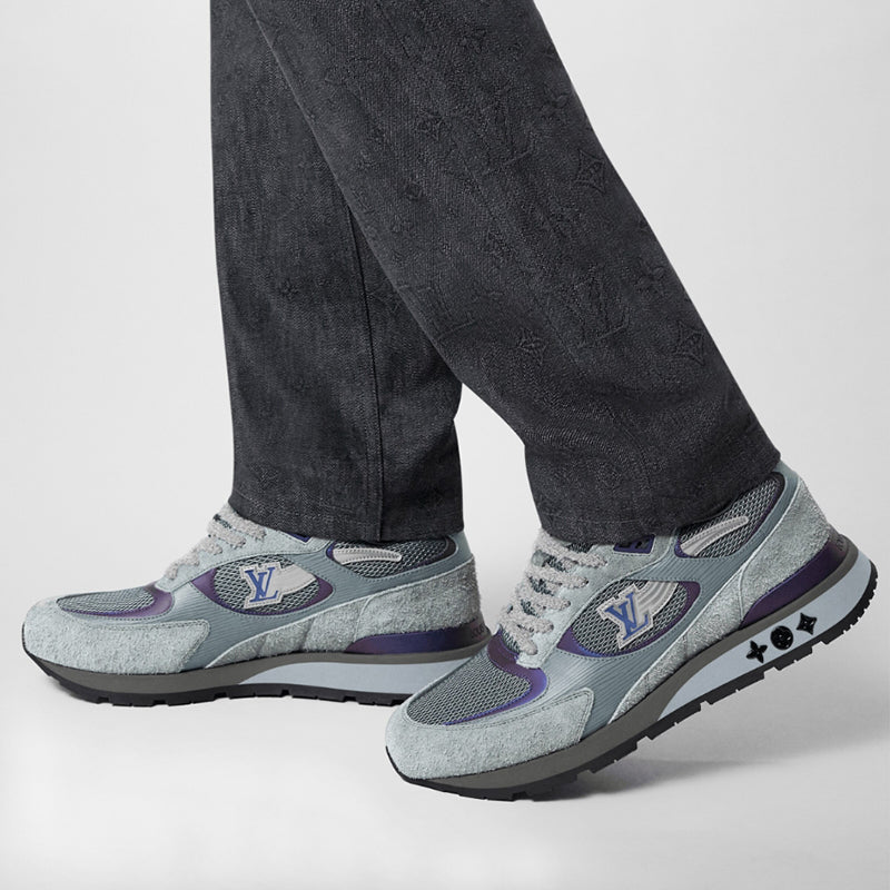 • ランアウェイスニーカーはスエード、エピ、テクニカル メッシュで作られており、軽量のマイクロ素材がウェッジ アウトソールを形作っています。サイドのLVの文字が彗星のような長い尾のように踊り、モノグラムフラワーがアウトソールを飾ります。